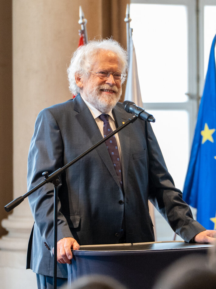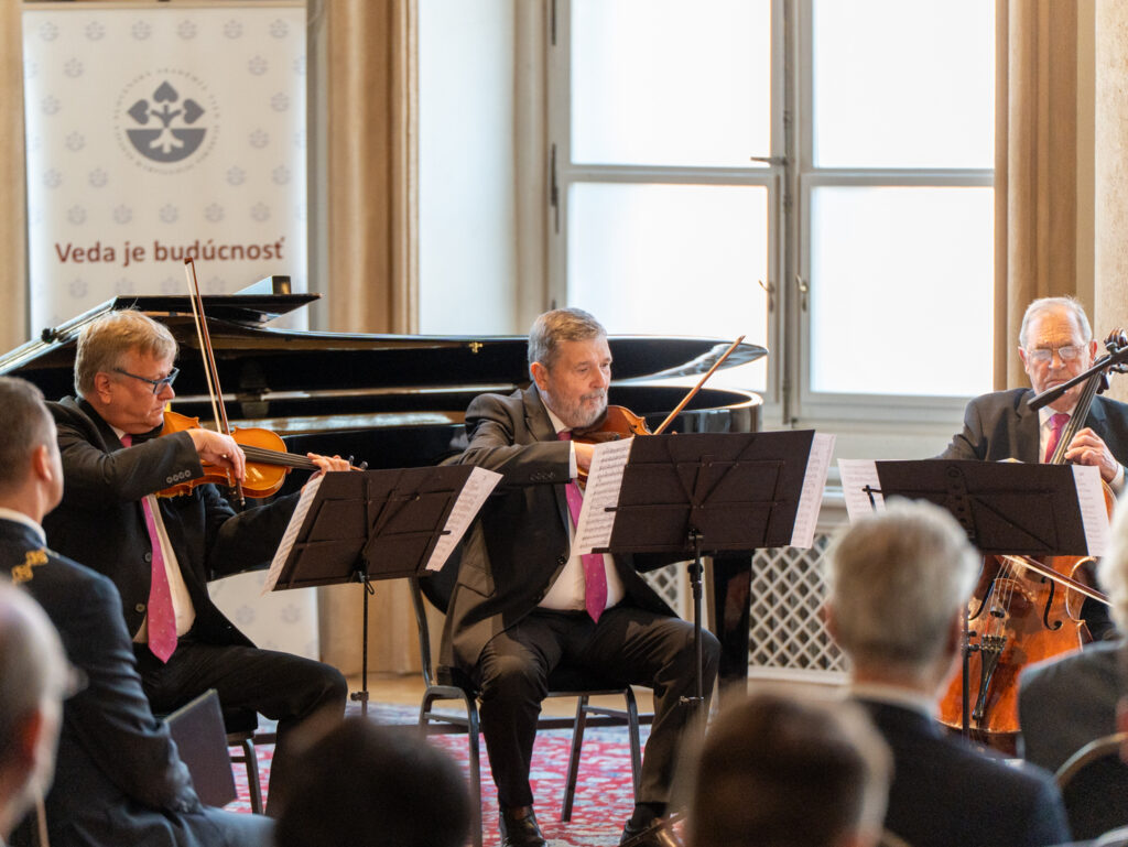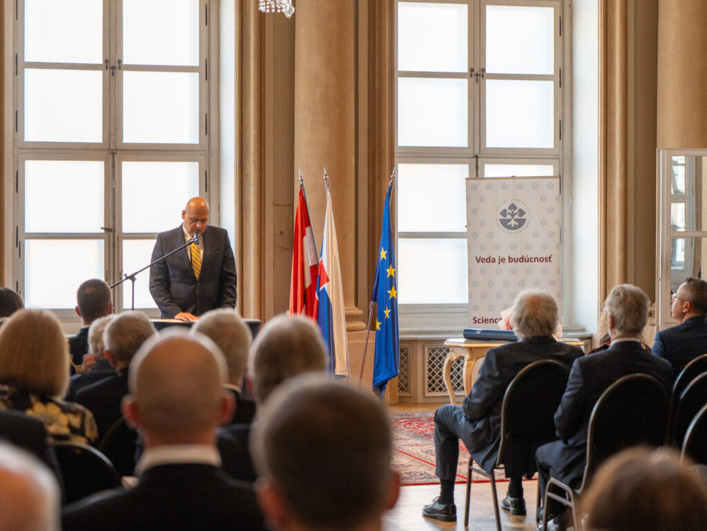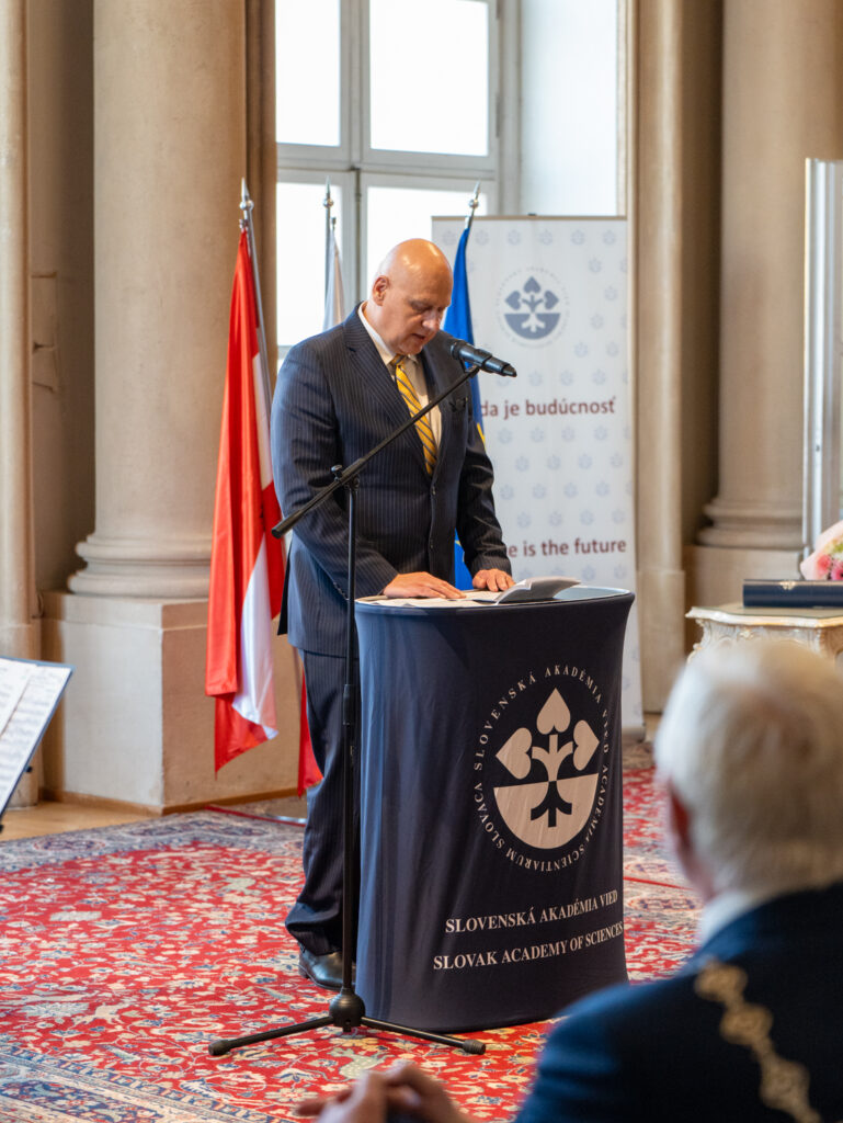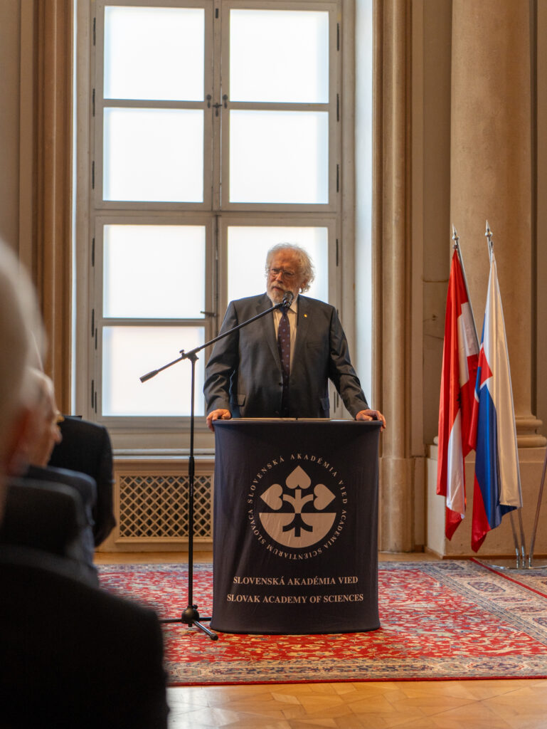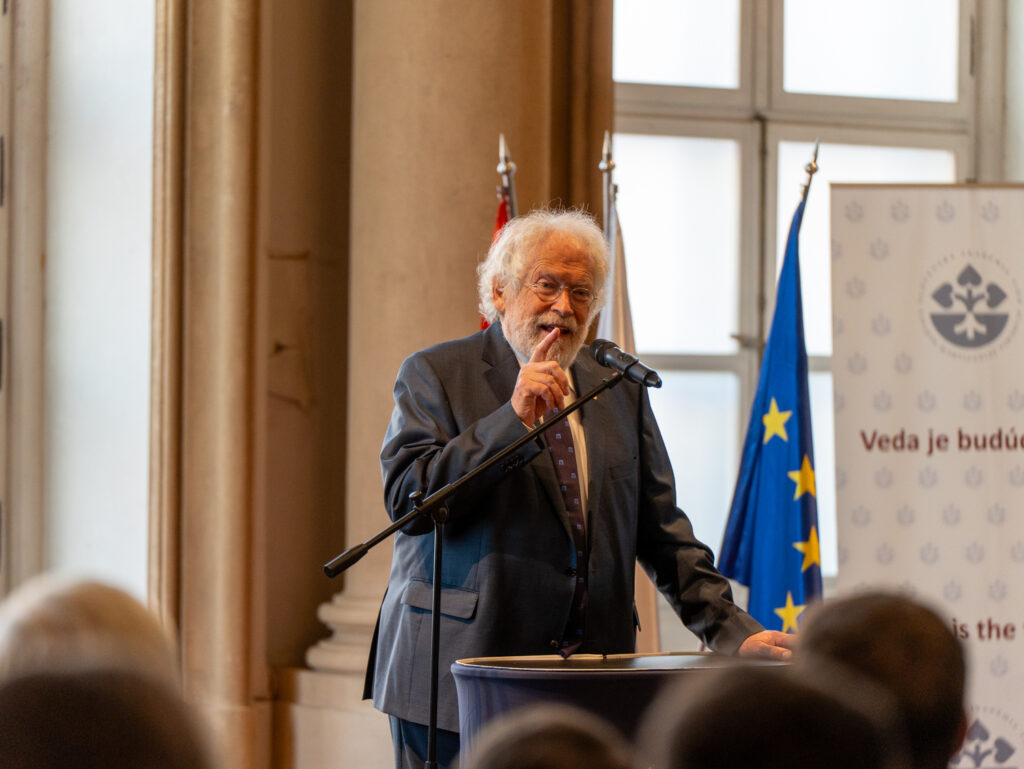 Following the opening fanfares President of the Slovak Academy of Sciences , Dr. Martin Venhart, delivered a powerful address honoring Professor Zeilinger’s remarkable contributions to quantum physics. He emphasized how Zeilinger’s pioneering experiments transformed abstract theory into experimental reality, providing empirical proof of quantum entanglement – what Einstein once called “spooky action at a distance”, linking his discoveries to our understanding of the universe itself. He also reflected on the importance of European cooperation, noting that the collaboration between Professor Zeilinger and Slovak physicist Professor Vladimír Bužek stands as “the most illustrative example of what can be achieved in a democratic, free, open, and unified world and society.”
