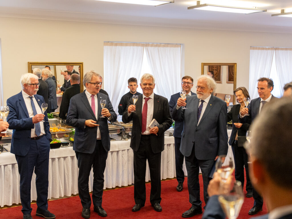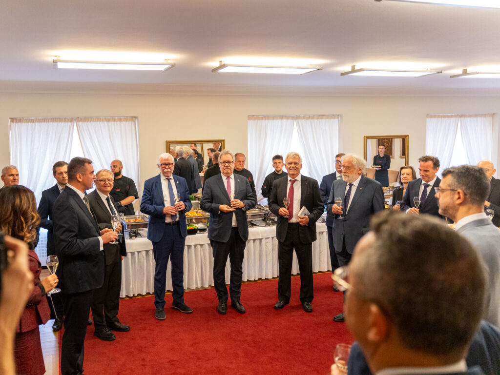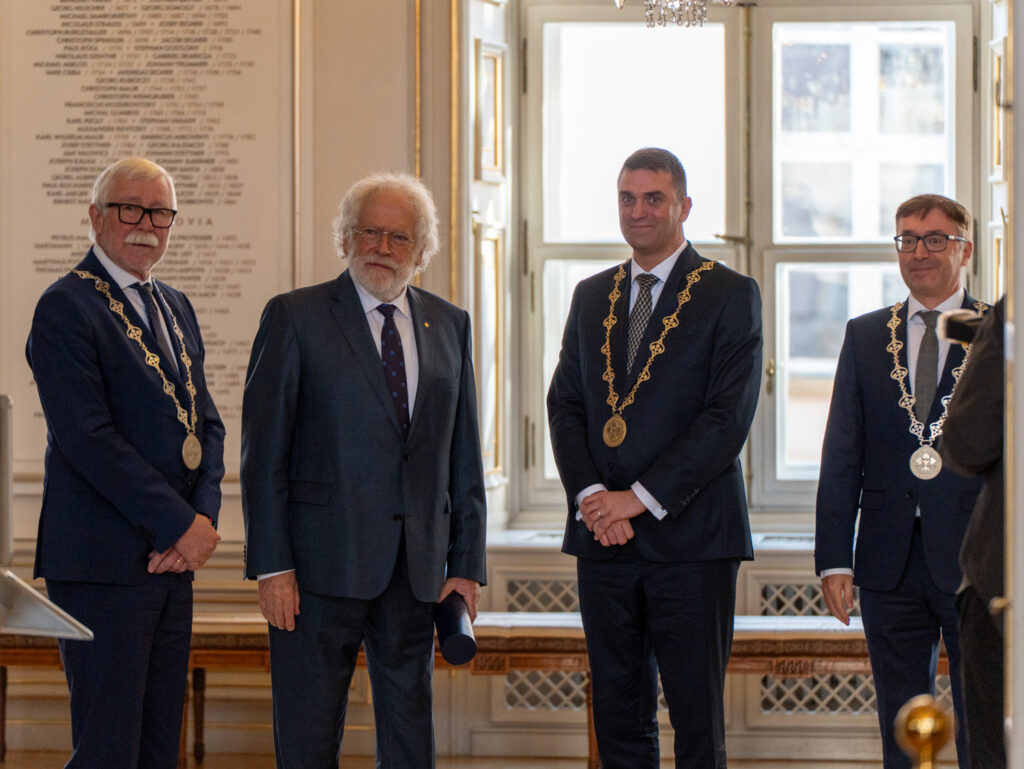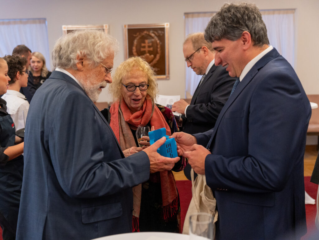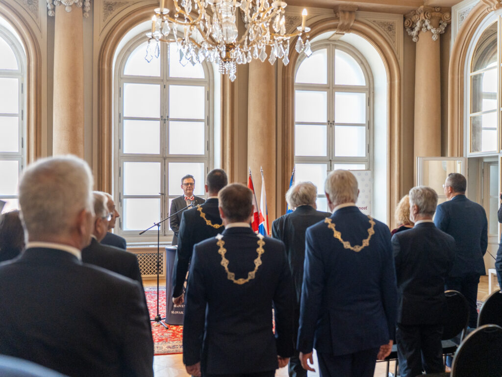 From left to right: Prof. Pavol Šajgalík (former President of the Slovak Academy of Sciences), Prof. Anton Zeilinger(Nobel Laureate and Honorary Doctor of SAS), Dr. Pavol Venhart (current President of SAS), and Dr. Radoslav Passia, departing the Mirror Hall and proceeding to the reception following the ceremony.