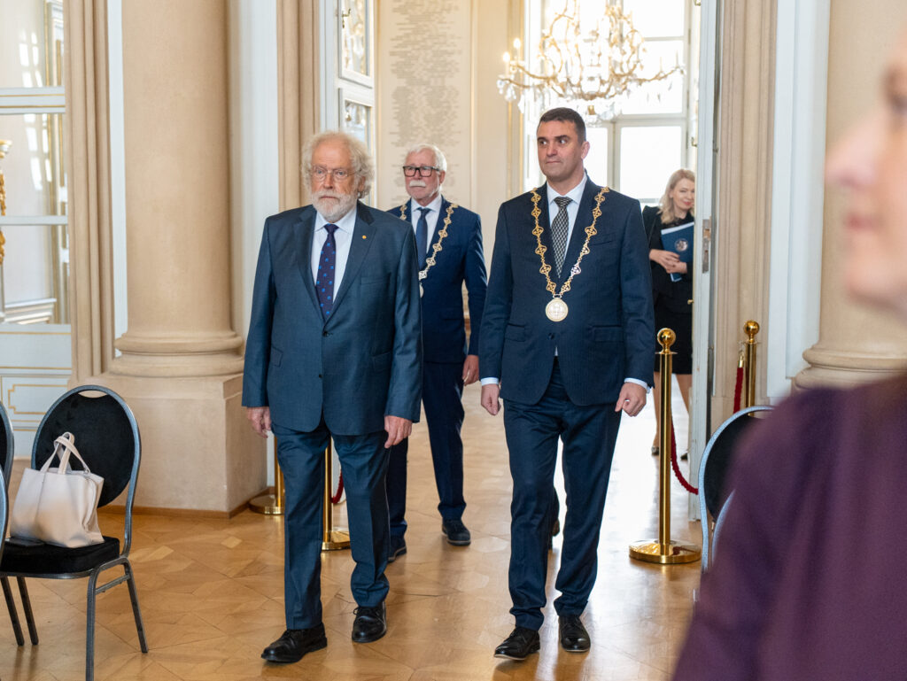 From left to right: Prof. Pavol Šajgalík (former President of the Slovak Academy of Sciences), Prof. Anton Zeilinger(Nobel Laureate and Honorary Doctor of SAS), Dr. Pavol Venhart (current President of SAS), and Dr. Radoslav Passia, departing the Mirror Hall and proceeding to the reception following the ceremony.