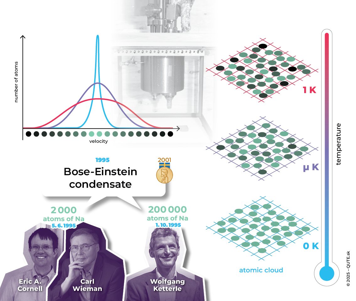Bose–Einstein condensate – the fifth state of matter. At temperatures close to absolute zero, all bosons share the same properties. This phenomenon was first observed in 1995 in systems of Rb and Na atoms and was later awarded a Nobel Prize.