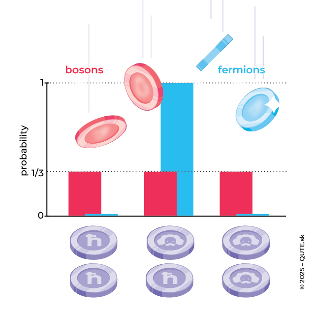 Grouping vs. exclusion. If we flip two bosonic coins at the same time, we observe three possible outcomes (Bose–Einstein statistics). Two fermion coins, however, always end up with opposite values (Fermi–Dirac statistics).