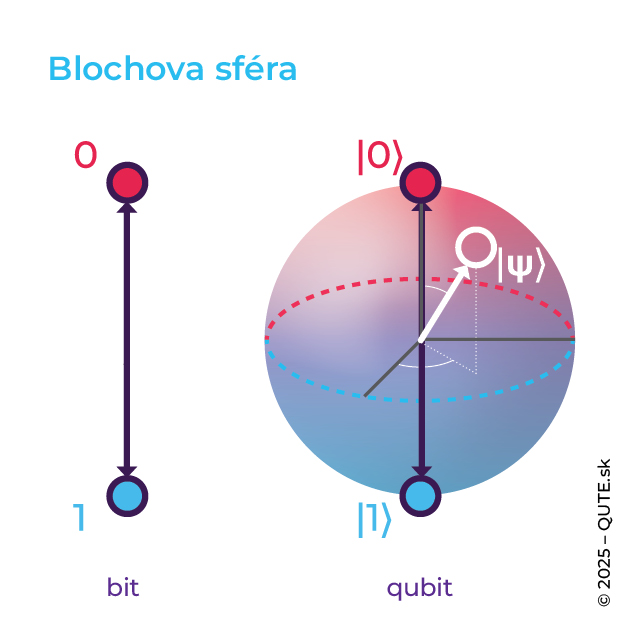Superpozície však nie sú akési zahmlené číselné hodnoty a vlastnosti medzi nulou a jednotkou. Sú to jasne definované kvantové hodnoty (stavy) qubitu, rovnaké ako tie, ktoré kódujú nulu a jednotku. Kvantové stavy qubitu si vieme zobraziť ako body na povrchu gule – koncové body vektorov smerujúcich zo stredu gule. Komponenty vektora sú však navzájom kvantovo neurčité. Qubit má určenú komponentu iba v jednom smere a môže mať iba dve určité hodnoty, ktoré zodpovedajú stavom s navzájom opačne orientovanými vektormi.