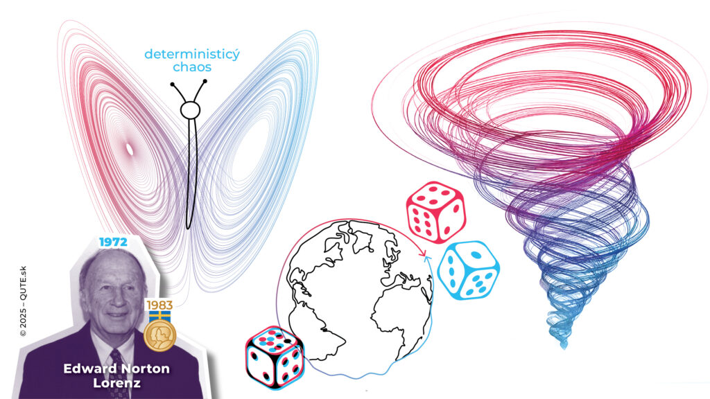 Motýlí efekt (Edward N. Lorenz, 1972) ilustruje na príklade počasia citlivosť vývoja systému na počiatočnom stave. Rozdiel zodpovedajúci mávnutiu motýlieho krídla v amazonskom pralese môže spôsobiť kdekoľvek na Zemi tornádo namiesto sucha. Znázornené motýlie krídla sú tzv. podivným atraktorom – objektom, ktorý vzniká pri študovaní deterministického chaosu.