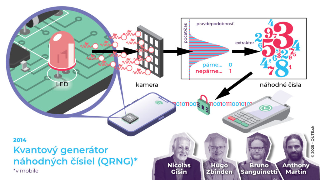RNG sú nenápadnou, ale veľmi dôležitou a rozšírenou technológiou. A kvantové systémy s náhodnosťou v “génoch” sú na konštrukciu takýchto zariadení ideálne. Či už ide o fotóny na polarizátore, alebo rádioaktivitu. Certifikované kvantové generátory náhodných čísiel (QRNG) si dnes môžeme kúpiť, zapojiť a používať. Na trhu nájdeme aj mobil so zabudovaným QRNG, ktorý pri generovaní náhodných bitov (niekoľko gigabitov za sekundu) používa kvantovú náhodnosť v počte vyžiarených fotónov z fotodiódy. Náhoda, ktorá dodáva istotu našim dátam a komunikácii.
