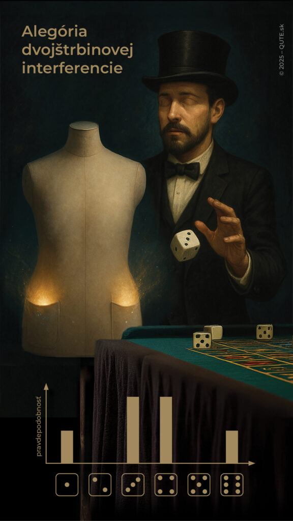 Alegória dvojštrbinovej interferencie. Vymyslená kvantová kocka má šesť hodnôt podobne ako bežná kocka, ale pri znázornenom interferenčnom „čarovaní“ niektoré hodnoty takouto kockou nehodíte.
