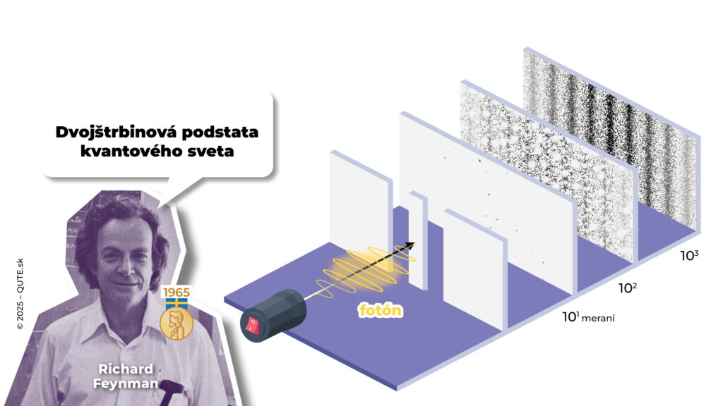 Jednofotónový dvojštrbinový pointilizmus. Vždy len jeden fotón preletí štrbinami a na fotografickej platni zanechá po sebe malú čiernu bodku. Fotón po fotóne postupne vybodkuje interferenčný obrazec. Prečo? Pretože svet je kvantový.