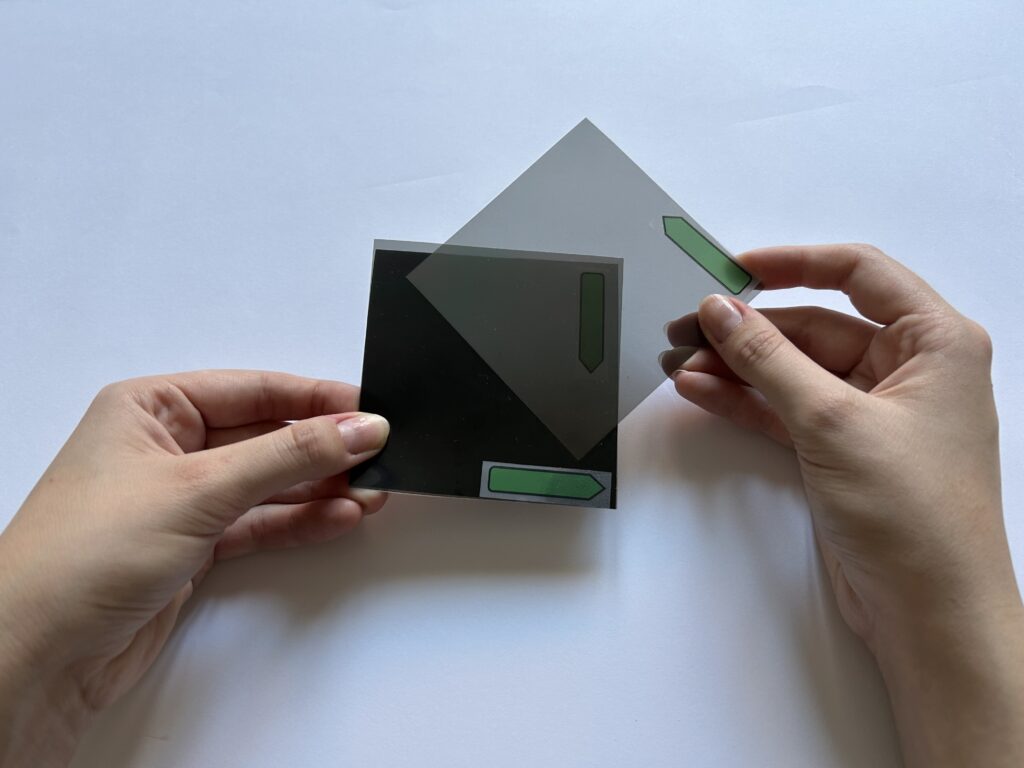Tip: na každý filter si kľudne nakresli fixkou šípku (do niektorého z rohov), ktorá ti potom ukáže, aké je vzájomné natočenie filtrov (pri kolmom nastavení dvojice filtrov budú ich šípky navzájom kolmé).