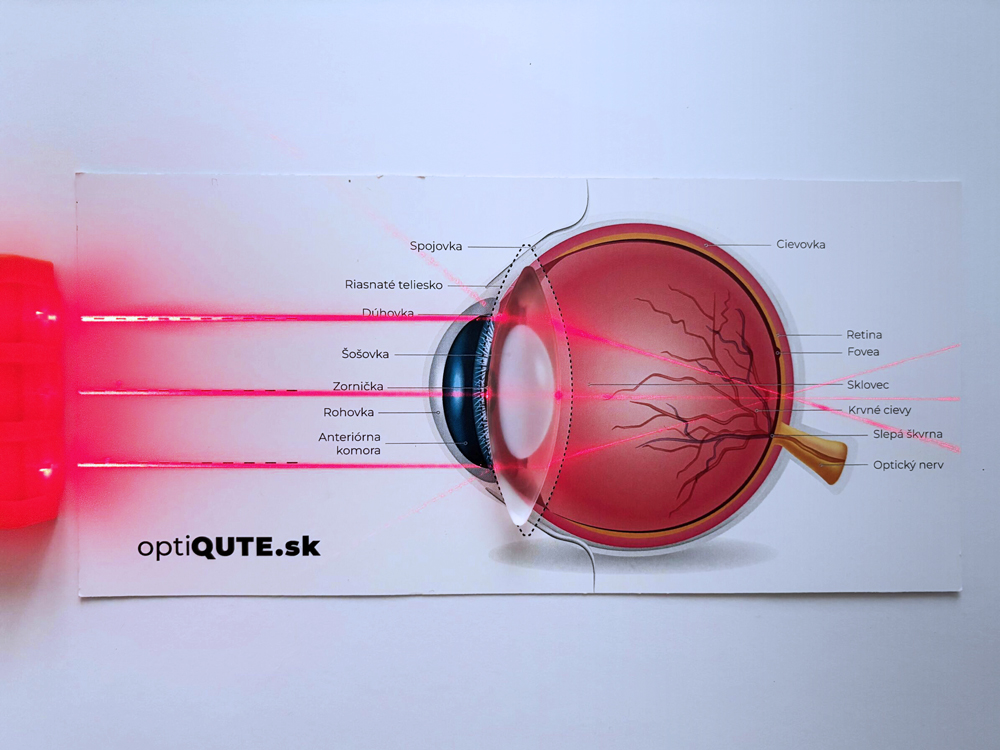 Vedľa schémy oka umiestni laserové zariadenie, ktoré vysiela tri rovnobežné lúče svetla. Laser nasmeruj tak, aby všetky tri lúče prechádzali presne cez predkreslené časti. Na mieste, kde je na obrázku nakreslená šošovka, umiestni skutočnú šošovku-spojku. Táto šošovka má za úlohu fyzicky zalomiť svetelné lúče podobne, ako to robí skutočné oko. Pozoruj, ako sa lúče po prechode spojkou lámu a zbiehajú v jednom bode, na zadnej časti oka, kde je na obrázku zobrazená sietnica.