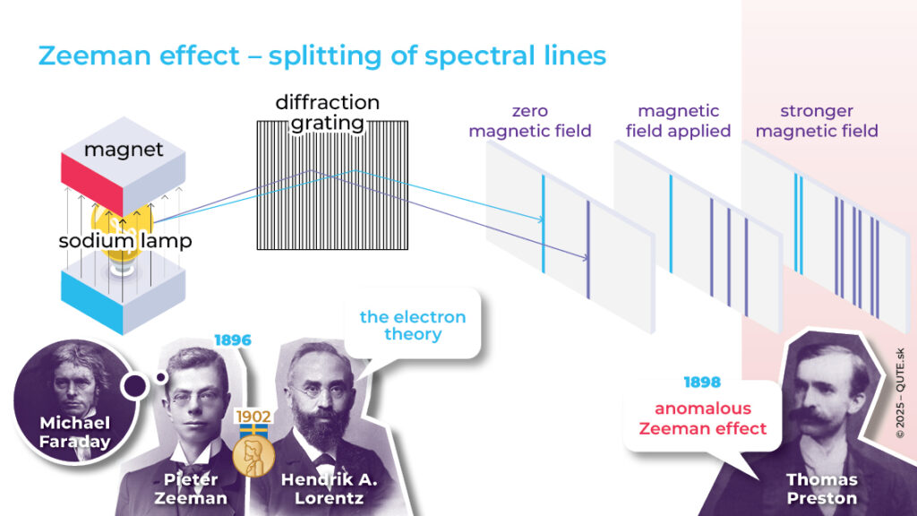 Faraday once attempted, unsuccessfully, to measure the influence of a strong magnetic field on the light emitted by atoms. 30 years later, P. Zeeman repeated Faraday’s experiments, but used a new invention – artificially produced optical diffraction gratings. Thanks to their higher sensitivity, he observed in 1896 a splitting of spectral lines – a change in the frequencies of photons emitted by sodium atoms placed in a magnetic field. Not only did the frequencies shift with the strength of the magnetic field, but the very presence of the field also changed the number of observed lines.