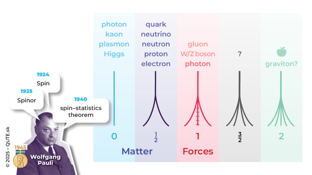 Spin is not a specialty of the electron. Every quantum system, in addition to its “orbital” angular momentum, also has its own internal rotational world – spin. Its magnitude is ħ s(s+1), but unlike orbital angular momentum, the values of spin are s = 0, 1⁄2, 1, 3/2, 2, … the so-called half-integer numbers. Electrons, protons, neutrons, quarks, and neutrinos are all particles with half-integer spin. In 1927, Pauli came up with a way to describe systems with spin within quantum physics. In this framework, the electron is described by a pair of quantum waves – one for each value of its spin component, and the pair as a whole behaves according to the Schrödinger equation.