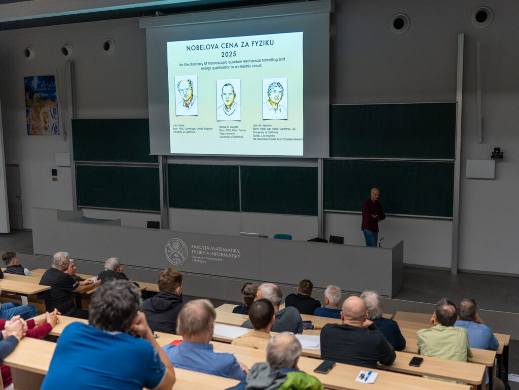 Dňa 20. novembra 2025 Fakulta matematiky, fyziky a informatiky Univerzity Komenského v Bratislave hostila prednášku colloQUTE vedenú prof. Miroslavom Grajcarom, ktorú zorganizovala Katedra experimentálnej fyziky. Podujatie prilákalo široké akademické publikum a bolo zakončené živou diskusiou o jednom z najvýznamnejších ocenení v súčasnej vede.